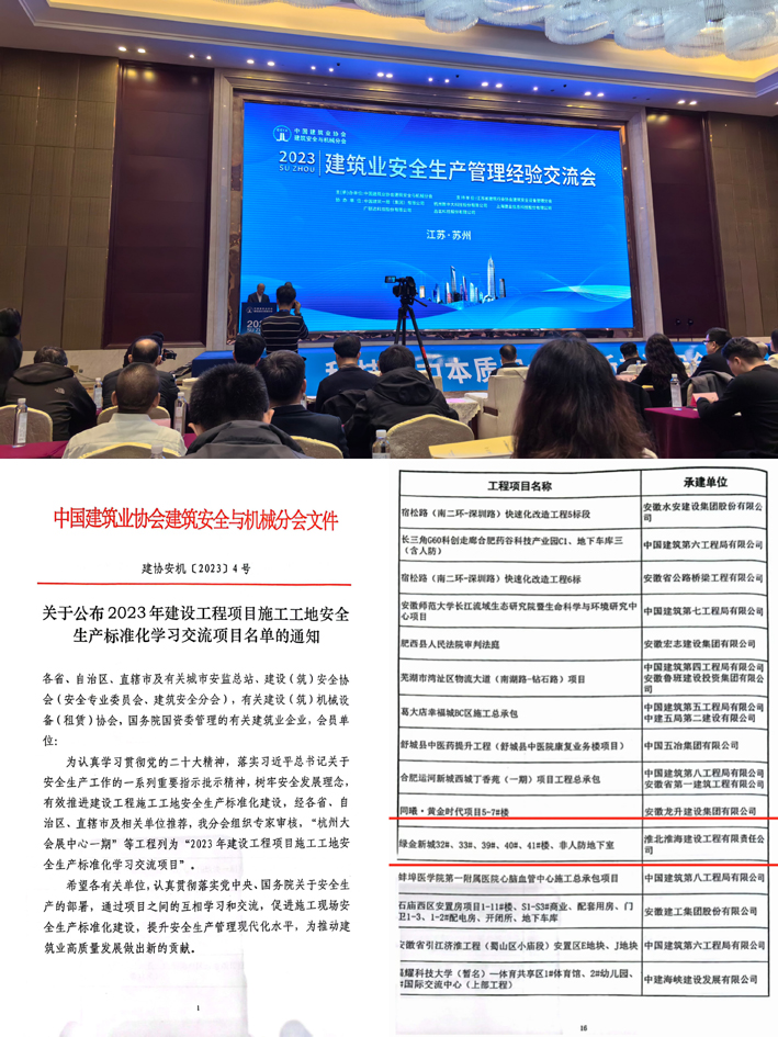 12月15日,由中國(guó)建筑業(yè)協(xié)會(huì)建筑安全與機(jī)械分會(huì)主辦的2023年建筑安全生產(chǎn)管理經(jīng)驗(yàn)交流會(huì)在蘇州召開(kāi),淮海建工公司綠金新城二期工程獲評(píng)全國(guó)建設(shè)工程項(xiàng)目施工安全標(biāo)準(zhǔn)化項(xiàng)目。這是該工程在獲評(píng)淮北市建筑安全生產(chǎn)標(biāo)準(zhǔn)化示范工地、安徽省建筑安全生產(chǎn)標(biāo)準(zhǔn)化示范工地等榮譽(yù)后獲得的又一殊榮,為目前國(guó)家建設(shè)部批準(zhǔn)的全國(guó)范圍內(nèi)建筑安全文明施工領(lǐng)域的高級(jí)別獎(jiǎng)項(xiàng)。